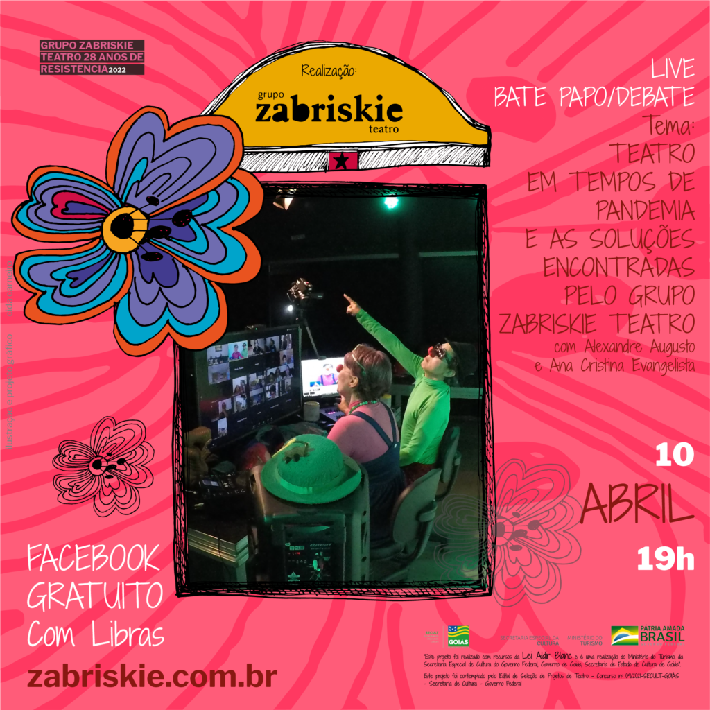 Alexandre Augusto e Ana Cristina Evangelista dos Santos integrantes do Grupo Zabriskie Teatro também realizarão uma live pelo Facebook do Grupo Zabriskie Teatro, com uma hora e 30 minutos de duração, na qual comentarão como tem sido a experiência de realizar as atividades do Grupo Zabriskie Teatro no modo online, em tempos de pandemia.